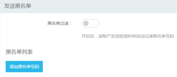 用戶點擊-【驗證碼通知短信】-【短信設置】-【發送黑名單】,可以開啟黑名單過濾功能,開啟之后,已添加的黑名單手機號將無法收到短信。