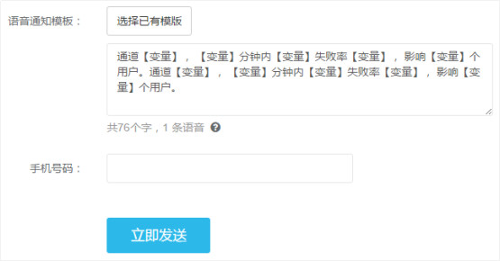 用戶點擊-【語音通知】-【在線發送】,可以選擇已經報備的模版,輸入手機號發送自定義語音模版內容。